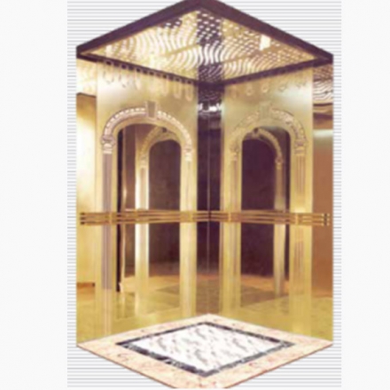轎頂裝潢:不銹鋼鏡面鏤空板和白色透光板,發紋不銹鋼框架